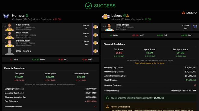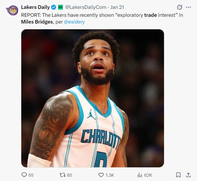 1月21日,埃文-斯迪瑞又報道,湖人與黃蜂已經就邁爾斯-布里奇斯進行過試探性的對話。實際上在小橋1月16日拿到25分8籃板4助攻幫助黃蜂擊敗湖人后,他的競技狀態就暴跌。