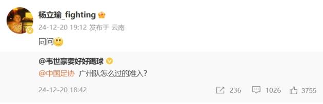 12月20日訊 韋世豪發聲質疑后,楊立瑜轉發韋世豪微博質疑足協準入。